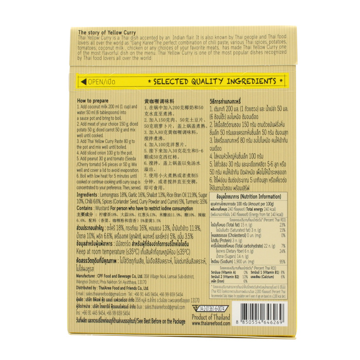 แกงเหลืองไทยคือสุดยอดอาหารพื้นบ้านที่หากินได้ยาก ผสานเสน่ห์วัฒนธรรมอินเดียอย่างลงตัว โดยคนไทยและนักชิมทั่วโลกต่างรู้จักในนาม “แกงกะหรี่”ด้วยศิลปะการปรุงชั้นเยี่ยม การผสมผสานระหว่างพริกแกงเข้มข้น เครื่องเทศไทยอันหลากหลาย มันฝรั่งชั้นดี มะเขือเทศสดใหม่ กะทิขาวนวล และเนื้อไก่หรือเนื้อสัตว์ชั้นเลิศตามความชอบ ส่งผลให้แกงเหลืองกลายเป็นอาหารรสชาติระดับตำนาน ที่ได้รับความนิยมและความประทับใจจากนักชิมทั่วทุกมุมโลก